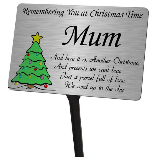 Christmas Tree Memorial Plaque & Stake for Mum. Brushed Silver