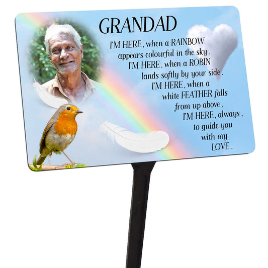 Personalised Memorial Plaque & Stake Your Photo. Robin Feather Rainbow Heart.